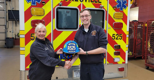 A well-deserved accomplishment for EMT Firestone. After successfully completed the required Prince William County Medical Director’s OMD program our EMTs enter our internal program that helps them achieve the goal of becoming the Attendant In Charge (AIC) of a crew. EMT Firestone has proven himself to be a leader in patient care and crew management. Rescue Chief Miller (L) presents EMT Firestone with his custom helmet shield.