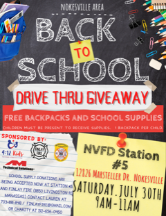 Kevin Kittrell, a former longtime member with Nokesville VFD, and his wife are holding a charity event (through the charity he and his wife started a few years ago in Texas) at Station 5 for back to school items for kids in need in our local area. It is a one-day event where people will drive up behind Station 5, pick up a backpack full of school supplies, and drive away. The event will last about two hours. Finlay Fire is a sponsor of the event and will be staffing the event and NVFD will also be offering our support.
